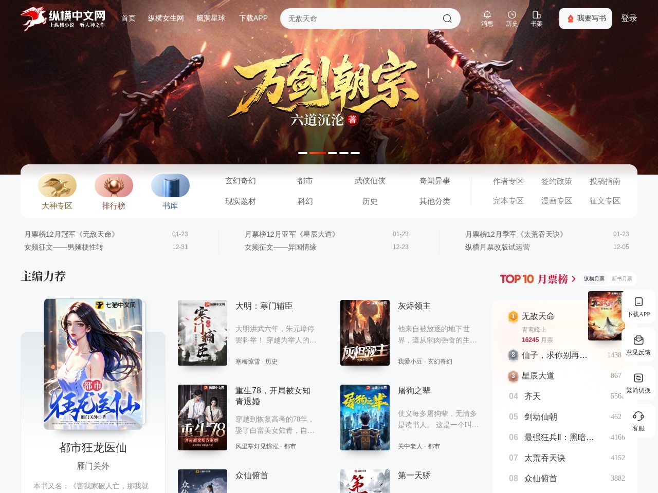 纵横中文网,最热门的免费小说网站,提供玄幻小说、网游小说、言情小说、穿越小说、都市小说等免费小说在线阅读与下载。大神作品齐聚纵横,最新章节每日更新。