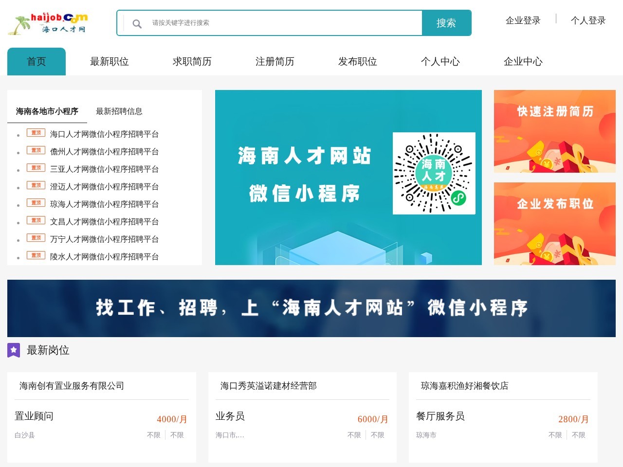 海口人才网是专注于海口的人才招聘网站,为海口企业提供职位发布,简历搜索等免费服务,为海口求职者提供最新职位信息,免费发布个人简历