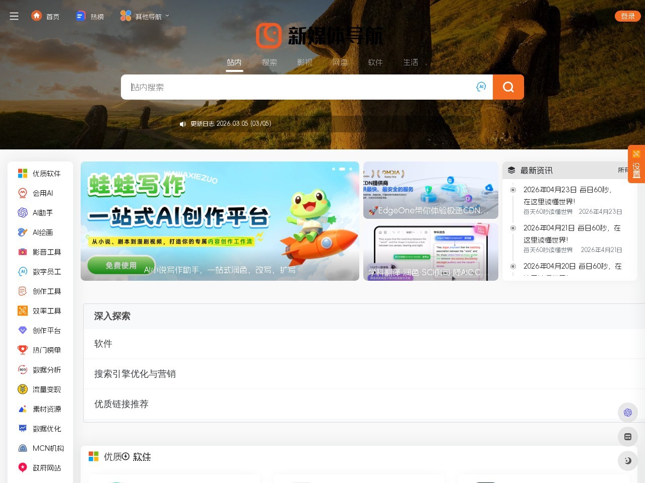 站长导航网系统是一个专业收录优质网站的网址导航平台,提供简洁高效的网络入口。免费提交收录,发现实用工具、设计资源、程序员必备站,打造您的专属上网主页 目前收录了 46829 个优质网站,涵盖 16 个分类,包括 云盘储存、目录导航、博客论坛、社会生活、影音娱乐 等。