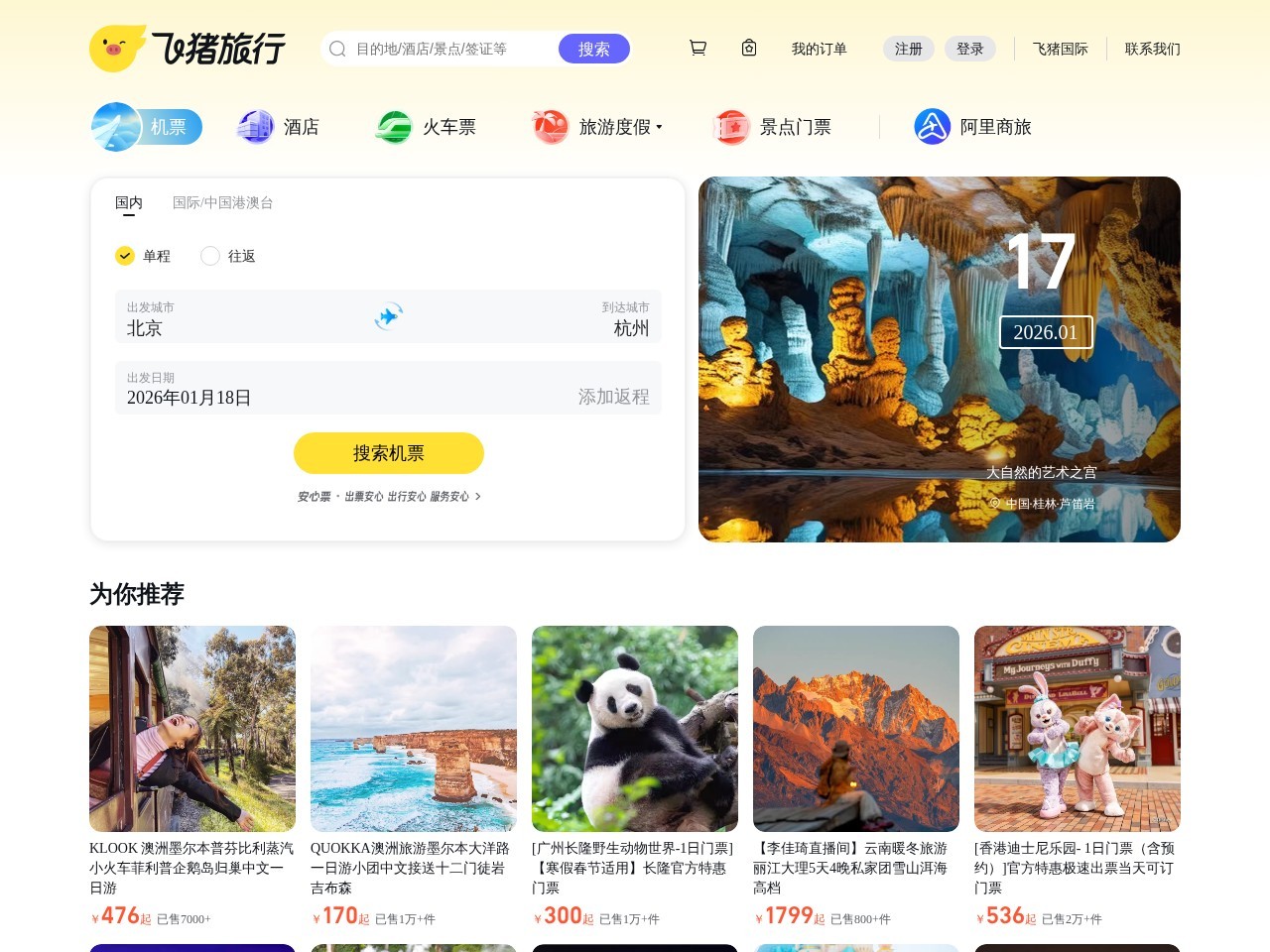 飞猪是阿里巴巴旗下的综合性旅游出行服务平台。飞猪整合数千家机票代理商、航空公司、旅行社、旅行代理商资源,直签酒店,客栈卖家等为广大旅游者提供特价机票,酒店预订,客栈查询,国内外度假信息,门票购买,签证代理,旅游卡券,租车,邮轮等旅游产品的信息搜索,购买及售后服务。全程采用支付宝担保交易,安全、可靠、有保证。