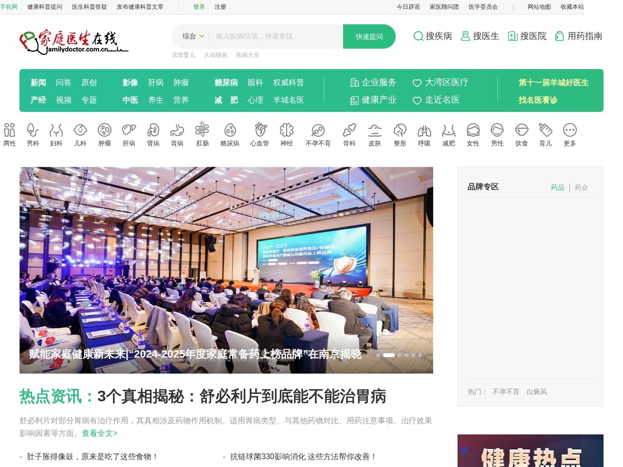家庭医生在线,中国最专业的健康门户网站,医疗保健类网站杰出代表,30年的品牌沉淀,几代人的健康代言。提供最专业、完善的健康信息服务,包括疾病,保健,健康新闻,专家咨询,病友论坛,男科,妇科,育儿,性爱,心理,整形,减肥,药品,急救,中医,美容,饮食,健身,医院查询,医生查询,疾病查询,药品查询,疾病自测等频道。